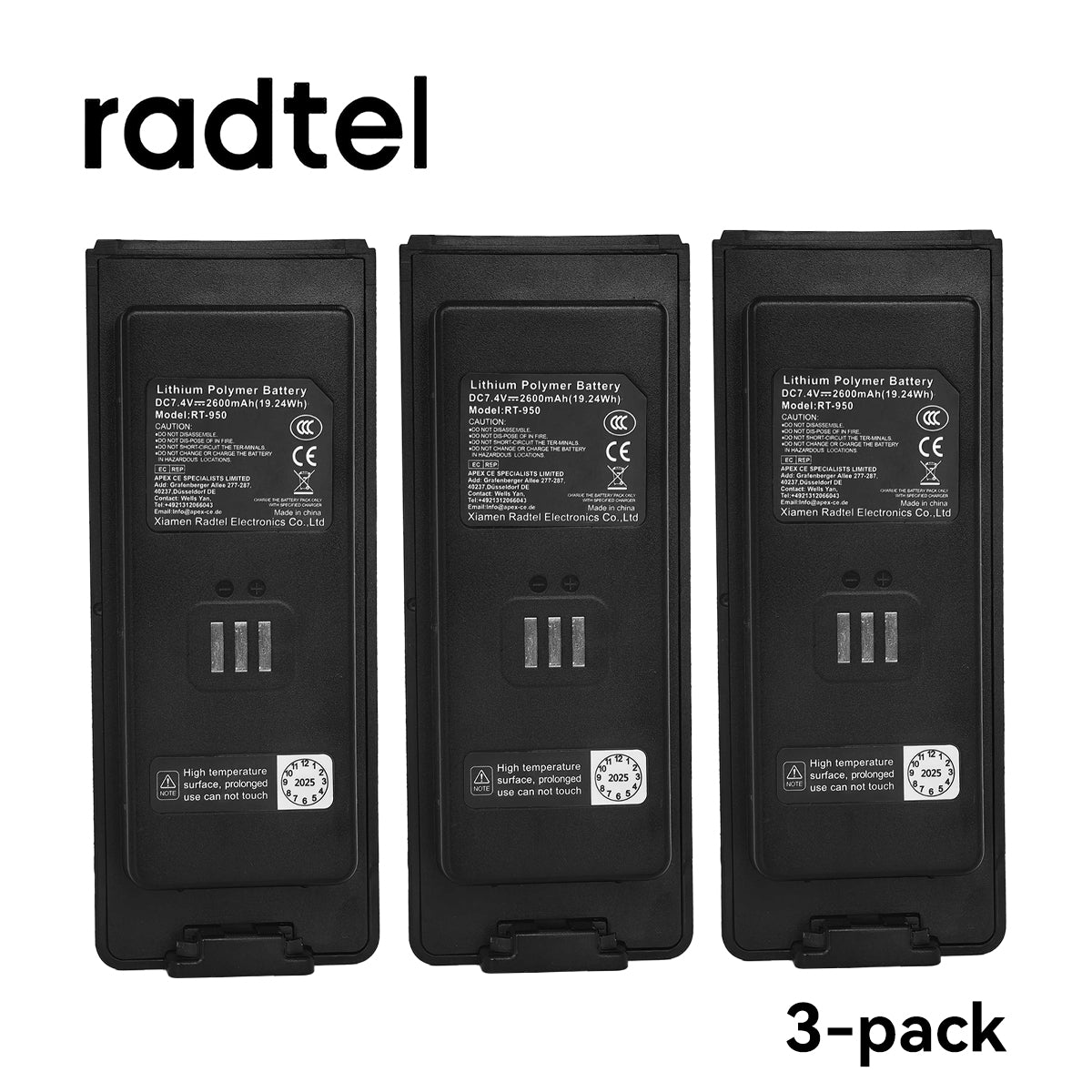 3 Pack Radtel RT-950 RT-950 PRO Rechargeable 2600mAh Li-ion Battery