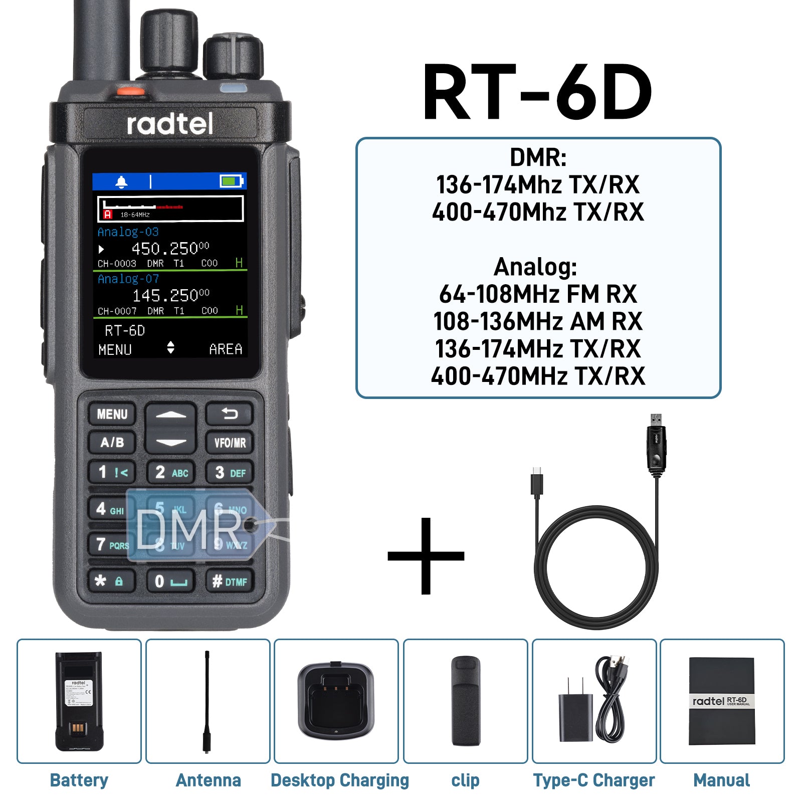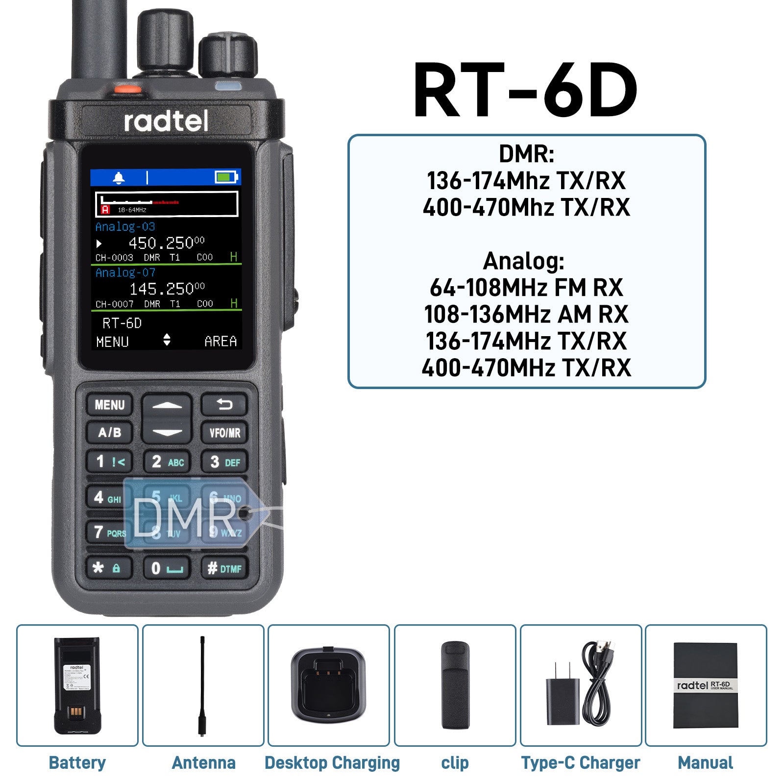 Radtel RT-6D DMR Radio 500K Contacts Dual Band Walkie Talkie Dual Time Slot Two Way Radio Tier 1+2 Ham Radio 1024 Channels